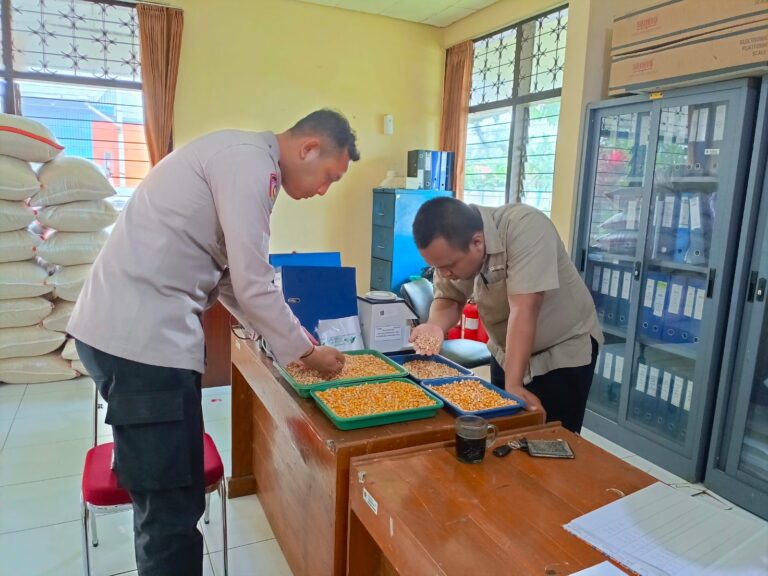 Polres Kuningan Polda Jabar – Melakukan evaluasi terhadap produktivitas lahan jagung hibrida di wilayah Mandirancan, jajaran kepolisian turut melakukan analisa terhadap kualitas fisik hasil panen masyarakat. Aipda Rosid dan Brigpol Singgih Priyogo membawa sampel jagung hibrida dari kelompok tani Sribungur ke laboratorium Bulog untuk mengetahui sejauh mana efektifitas pengolahan lahan terhadap kualitas bulir jagung yang dihasilkan.