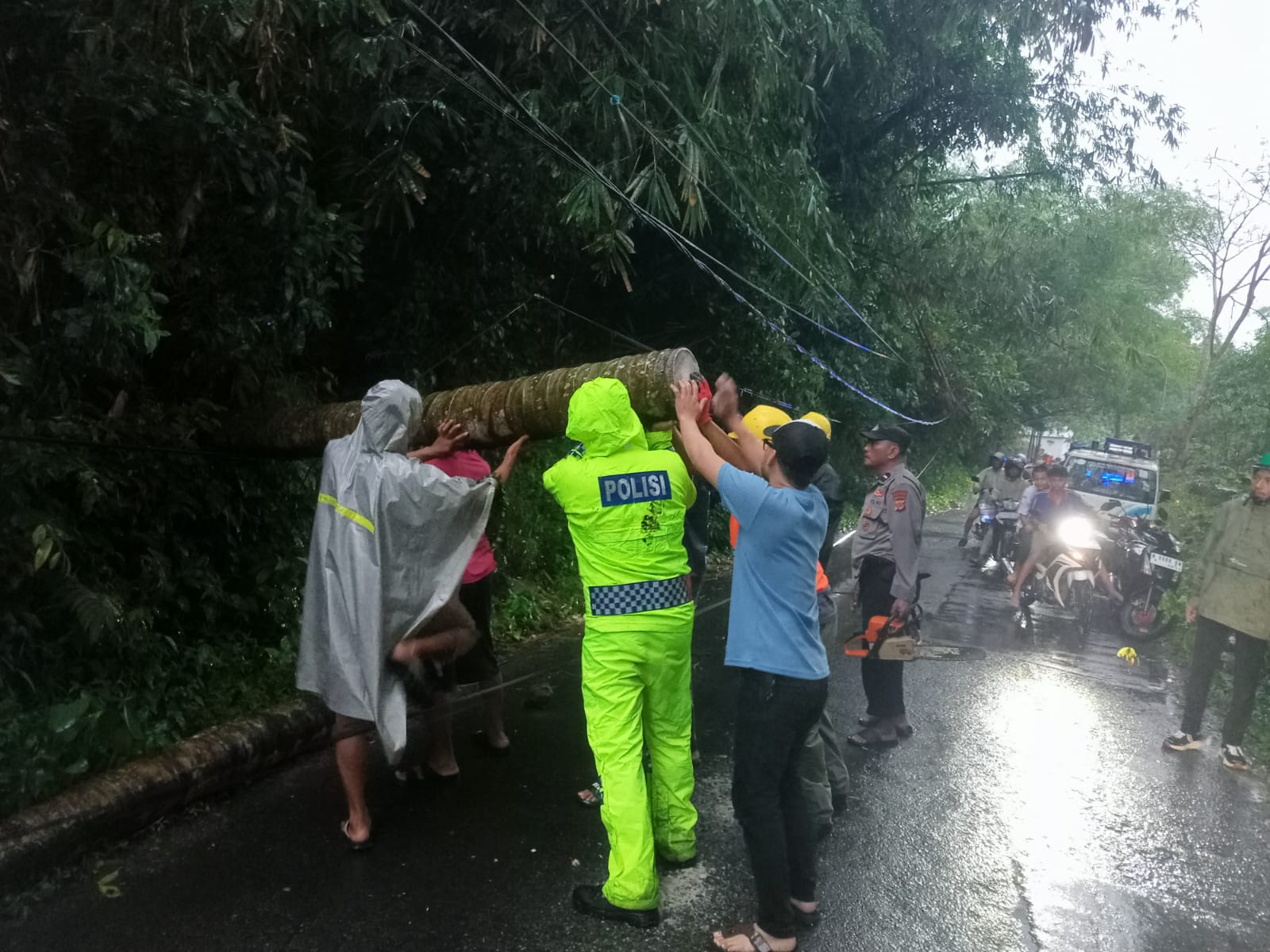Dalam proses evakuasi, Aiptu Gani dan Aiptu Agus Kurniawan bekerja sama dengan warga setempat untuk memindahkan pohon tumbang ke tempat yang aman. Mereka juga memberikan himbauan kepada masyarakat untuk selalu waspada dan berhati-hati saat melalui jalan yang terhalang pohon tumbang.