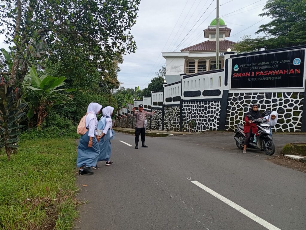Anggota Polsek Pasawahan Brigpol Pijay sanjaya melaksanakan giat PH pagi di SMAN 1 Pasawahan