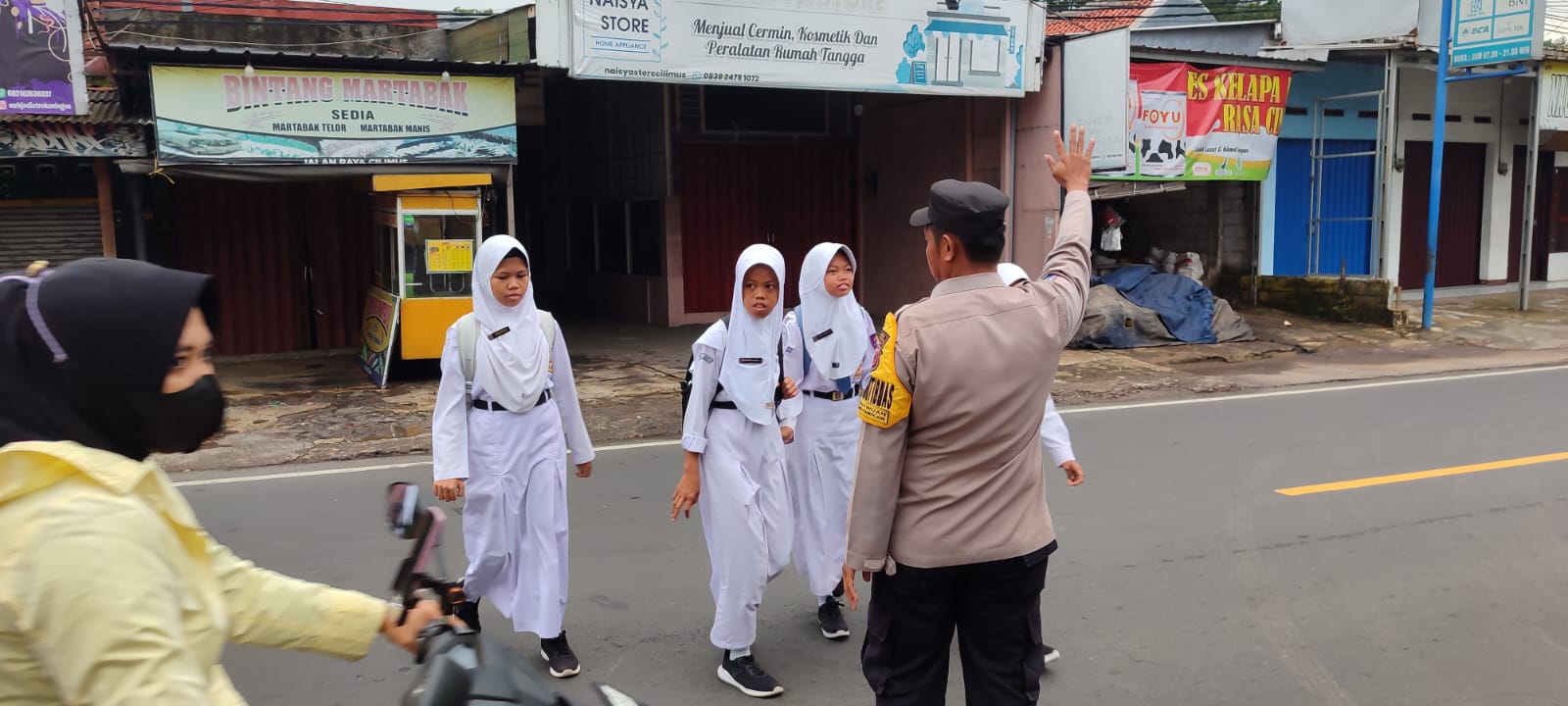 Anak-anak sekolah dibantu menyeberang dengan aman.