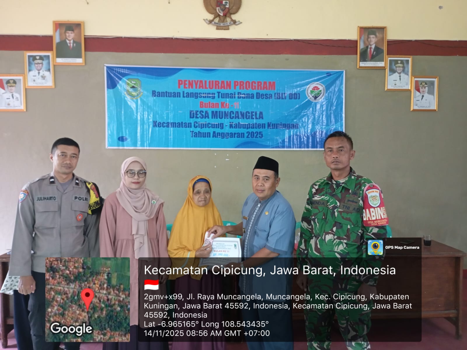 Polres Kuningan Polda Jabar – Bentuk sinergitas TNI–Polri terus diwujudkan dalam setiap kegiatan kemasyarakatan. Bhabinkamtibmas Desa Muncangela Polsek Ciawigebang Polres Kuningan Polda Jabar Aipda Juli Harto bersama Babinsa Desa Muncangela Koramil Ciawigebang Serda Nenda menghadiri sekaligus mengawal kegiatan penyaluran Bantuan Langsung Tunai Dana Desa (BLT-DD) bulan ke-11 (November) tahun 2025, Jumat (14/11).