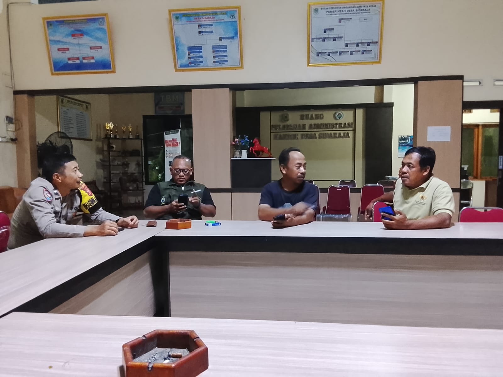 Bhabinkamtibmas Desa Sidaraja Sambangi Perangkat Desa Saat Piket Malam
