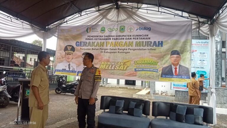 Polres Kuningan Polda Jabar – Dalam rangka mendukung kelancaran pelaksanaan Gerakan Pangan Murah, Bhabinkamtibmas Desa Susukan Polsek Ciawigebang Polres Kuningan Polda Jabar Aipda Ruhyaman melaksanakan monitoring dan pengecekan persiapan lokasi kegiatan di Balai Desa Susukan, Kecamatan Cipicung, Kabupaten Kuningan, Selasa (3/3/2026).