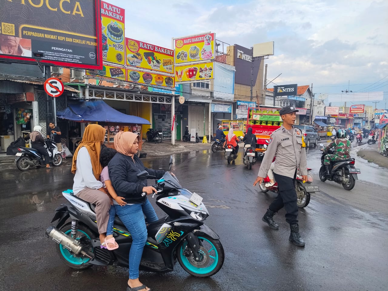Bhabinkamtibmas Amankan dan Atur Lalu Lintas Sore Hari Saat Ngabuburit di Persimpangan Pasar Ciawigebang