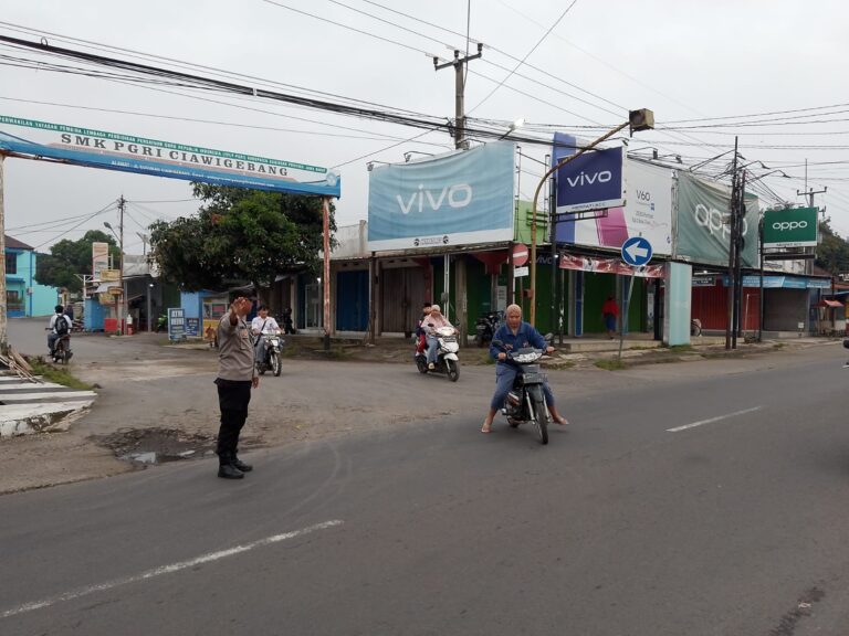 Wujud Pelayanan Prima, Bhabinkamtibmas Polsek Ciawigebang Polres Kuningan Atur Arus Lalin Pagi Hari di Simpang Tiga Alun-alun Desa Ciawigebang