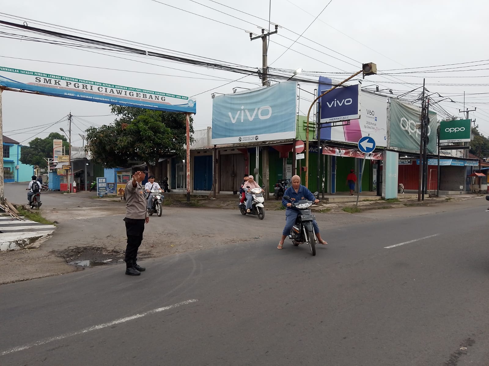 Bhabinkamtibmas Polsek Ciawigebang Atur Lalu Lintas di Gerbang Masuk SMK PGRI