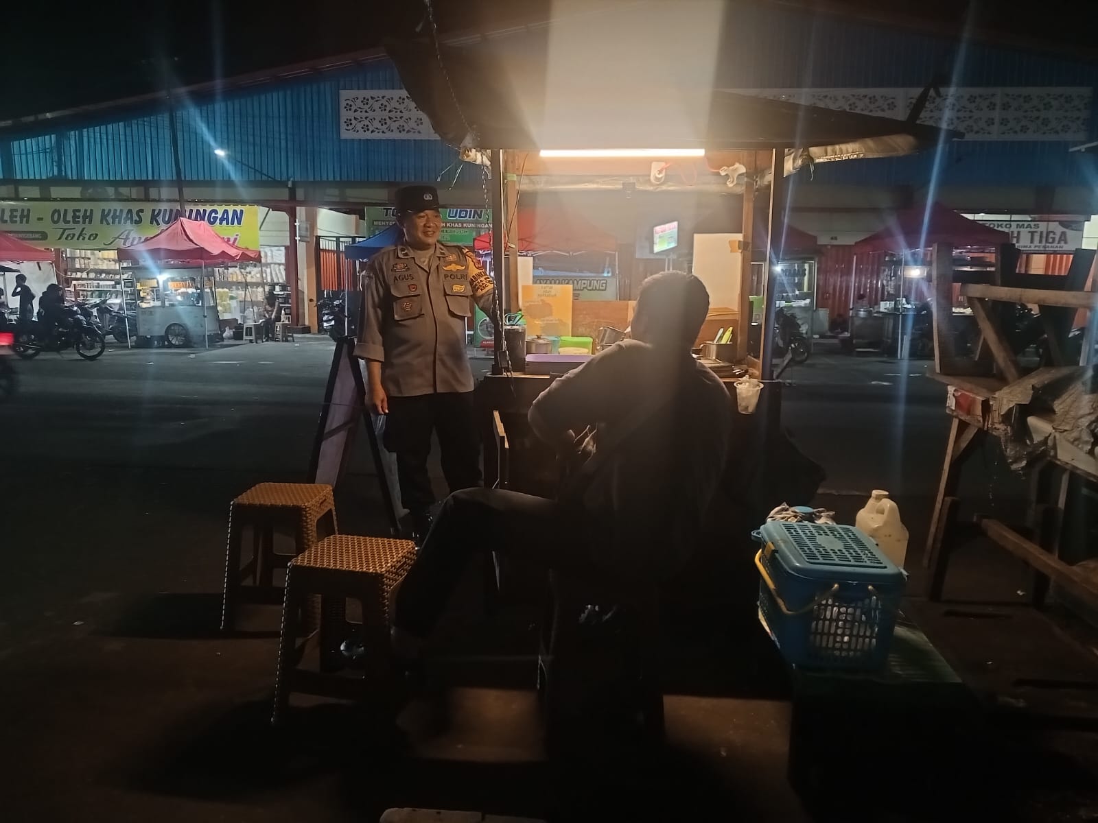 Polres Kuningan Polda Jabar – Anggota Bhabinkamtibmas Polsek Ciawigebang Polres Kuningan Polda Jabar Aiptu Iyang Hendriyana, S.H., bersama Aipda H. Agus Subono, S.H., melaksanakan patroli KRYD (Kegiatan Rutin Yang Ditingkatkan) pada malam hari dengan menyambangi warga di area Terminal Ciawigebang, Kecamatan Ciawigebang, Kabupaten Kuningan, Selasa (9/12).