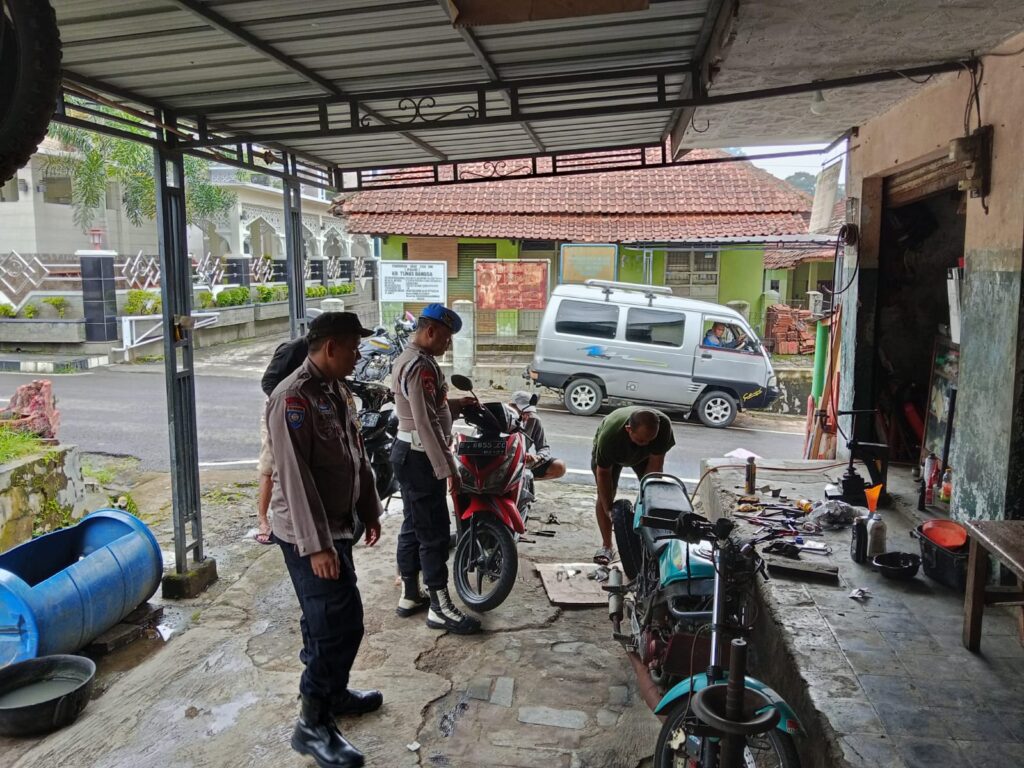 Bhabinkmatibmas Desa sungkup Aipda romli memberikan himbauan kepada pemilik bengkel motor