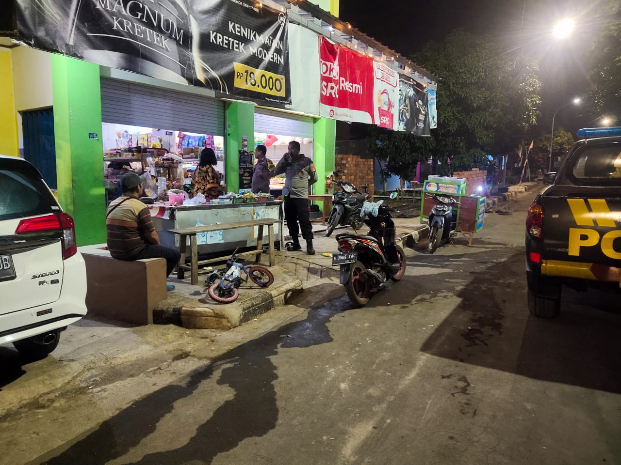 Petugas tampak berinteraksi dengan warga dan pedagang di sekitar pasar malam serta area pertokoan, sambil menyampaikan pesan agar masyarakat berhati-hati dalam beraktivitas dan menghindari tindakan yang berpotensi menimbulkan gangguan kamtibmas.