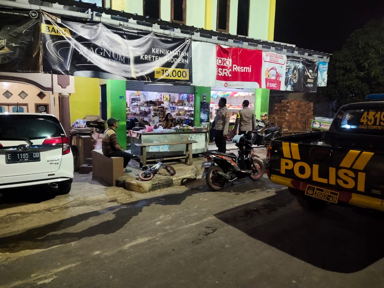 Petugas tampak berinteraksi dengan warga dan pedagang di sekitar pasar malam serta area pertokoan, sambil menyampaikan pesan agar masyarakat berhati-hati dalam beraktivitas dan menghindari tindakan yang berpotensi menimbulkan gangguan kamtibmas.
