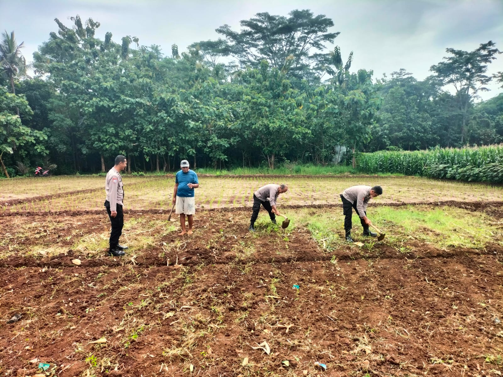 Polres Kuningan Polda Jabar – Dalam rangka mendukung program ketahanan pangan, Kapolsek Ciawigebang Polres Kuningan AKP Dani Supriadi, S.H., bersama anggotanya bersinergi dengan para petani Desa Lebaksiuh melaksanakan kegiatan penggarapan lahan kering untuk ditanami jagung hibrida. Kegiatan tersebut berlangsung di Desa Lebaksiuh, Kecamatan Ciawigebang, Kabupaten Kuningan, Selasa (16/12).