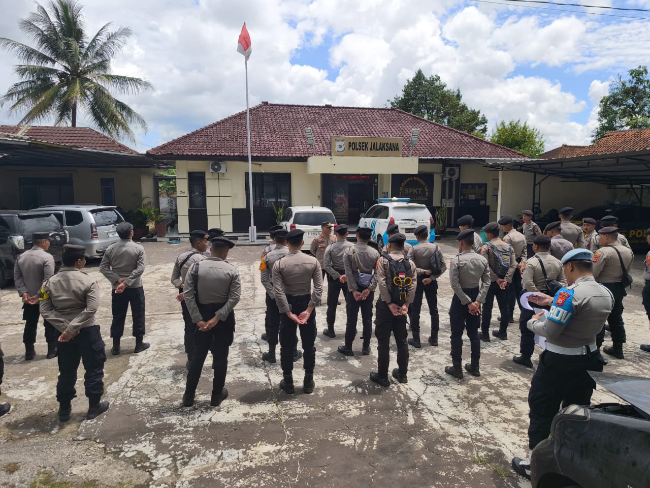 Polsek Jalaksana meningkatkan keamanan dan ketertiban masyarakat selama Jalsah Salanah JAI Kuningan, pada hari Minggu, 7 Desember 2025. Apel kesiapan siaga antisipasi gangguan kamtibmas dipimpin oleh PS. Kabag Ops Polres Kuningan AKP Rasikin.