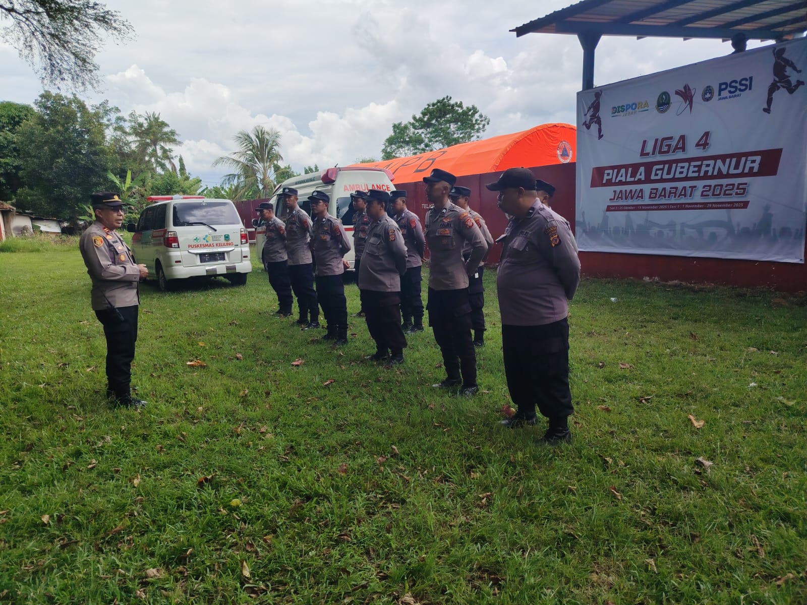 Kuningan – Kapolsek Ciwaru Iptu Sunardi, S.E bersama Kapolsek Luragung Iptu M. Topan, S.H memimpin langsung pelaksanaan pengamanan pertandingan sepak bola dalam ajang Liga 4 Piala Gubernur Jawa Barat yang digelar di Stadion Ibrahim Ajie, Kecamatan Luragung, Kabupaten Kuningan, Senin (27/10/2025).