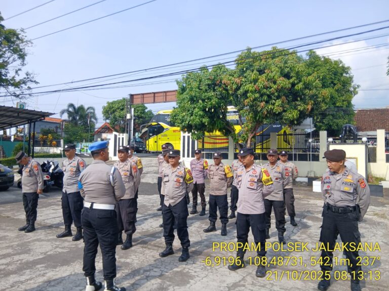Pada hari Selasa, tanggal 21 Oktober 2025, AKP Imam Rubianto, Kapolsek Jalaksana, bersama Kanit Propam Aipda R. Sidik, ST, melaksanakan apel pagi rutin di Mapolsek Jalaksana. Apel pagi ini bertujuan untuk meningkatkan kedisiplinan dan kinerja anggota Polsek Jalaksana dalam pelaksanaan tugas di lapangan.
