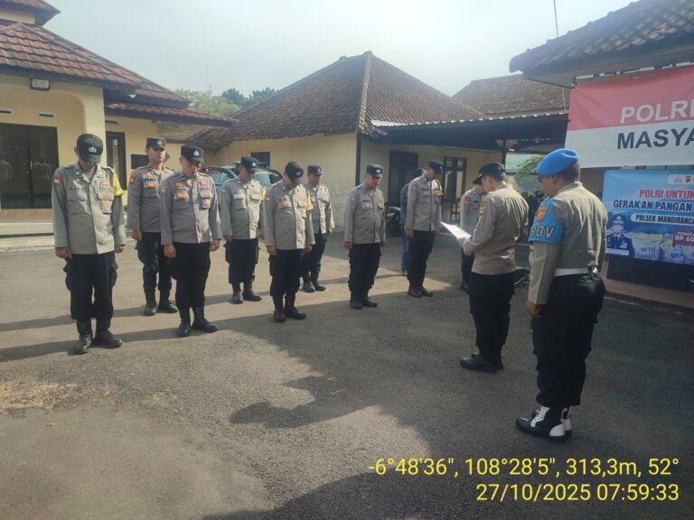 Polres Kuningan Polda Jabar – Untuk meningkatkan disiplin dan kesiapsiagaan anggota, Kapolsek Mandirancan AKP Atang Mulyana, S.E. memimpin apel pagi di Mapolsek Mandirancan, Kabupaten Kuningan, pada Selasa (28/10/2025). Kegiatan ini bertujuan memastikan seluruh anggota siap memberikan pelayanan terbaik kepada masyarakat.