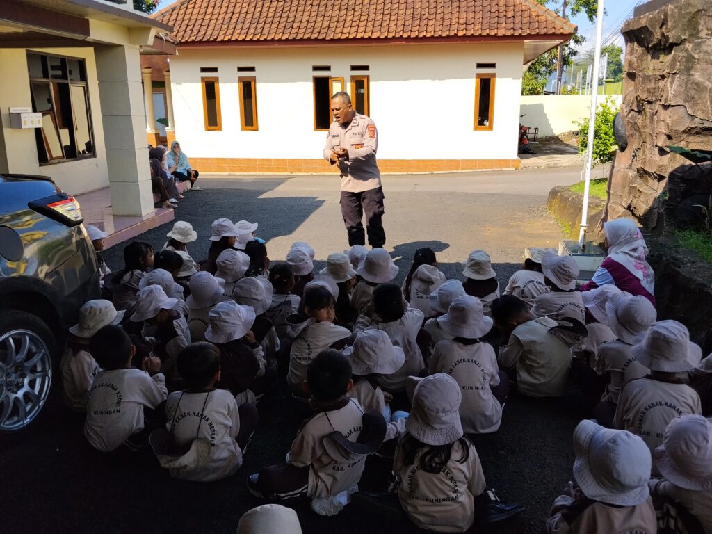 Lebakwangi – Suasana penuh keceriaan dan kehangatan tampak mewarnai kegiatan Polisi Sahabat Anak di Mapolsek Lebakwangi saat menerima kunjungan siswa TK Negeri Cinagara dalam kegiatan outing class, Rabu (15/04/2026) pukul 07.30 WIB.
