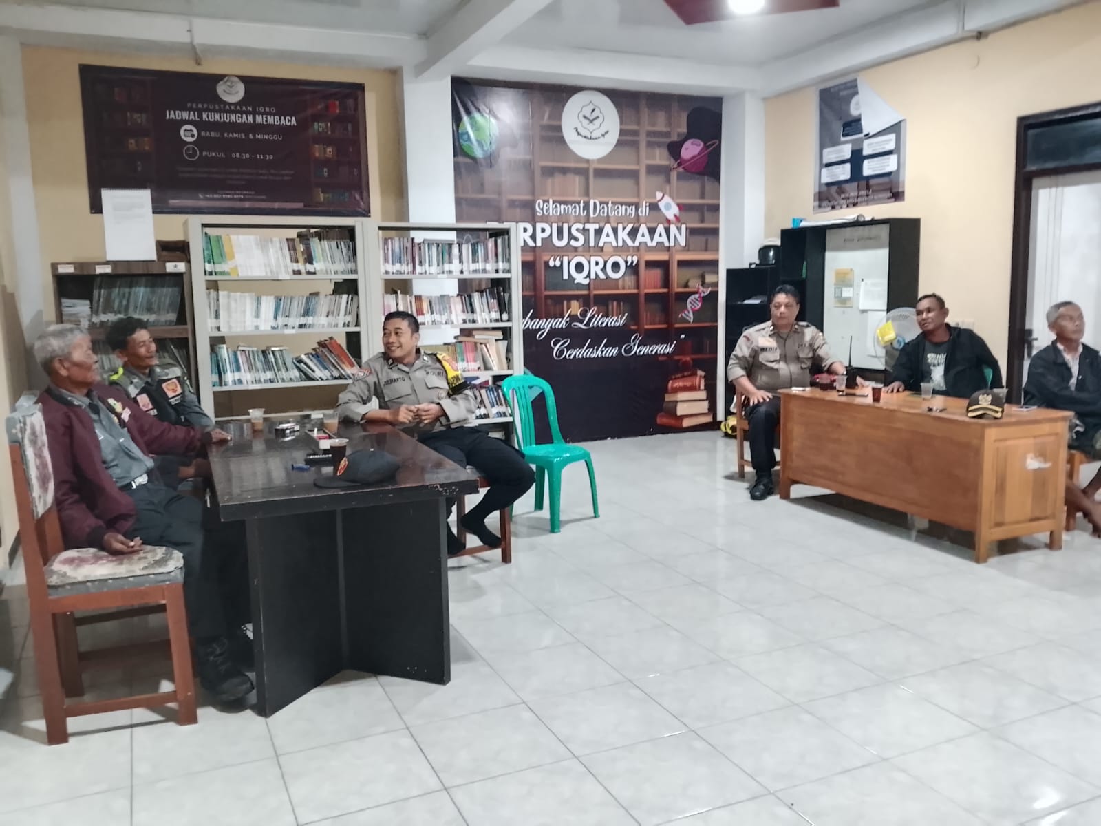 Seperti yang dilaksanakan oleh Aiptu Juli Harto bersama Aipda Mulyadi yang melaksanakan patroli cipta kondisi pada malam hari dengan menyambangi perangkat desa serta anggota Linmas Desa Muncangela yang sedang melaksanakan piket di Perpustakaan Desa Muncangela, Kecamatan Cipicung, Kabupaten Kuningan.