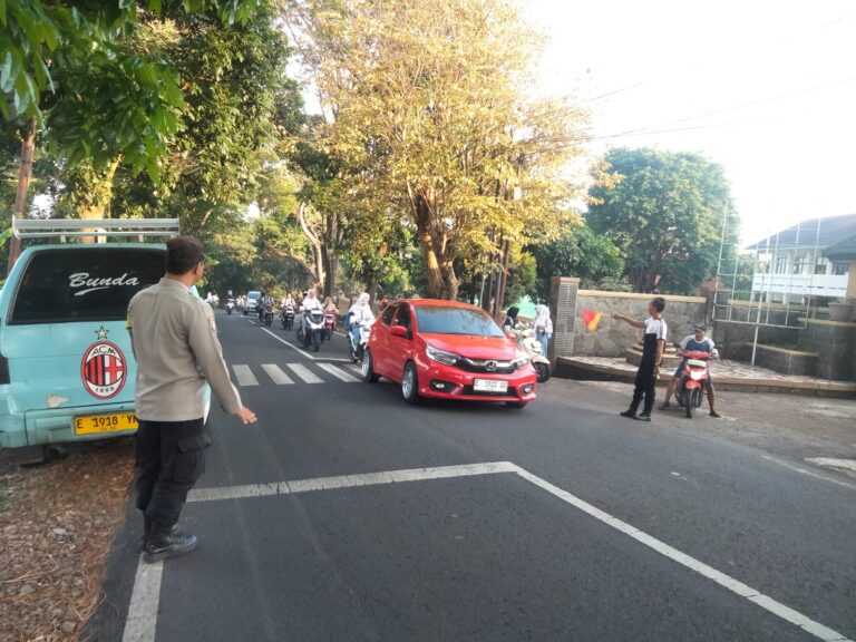 Petugas Polsek Mandirancan memantau setiap kendaraan yang melintas, mengatur alur kendaraan roda dua dan roda empat, serta mencegah potensi kecelakaan lalu lintas di jam sibuk pagi hari.