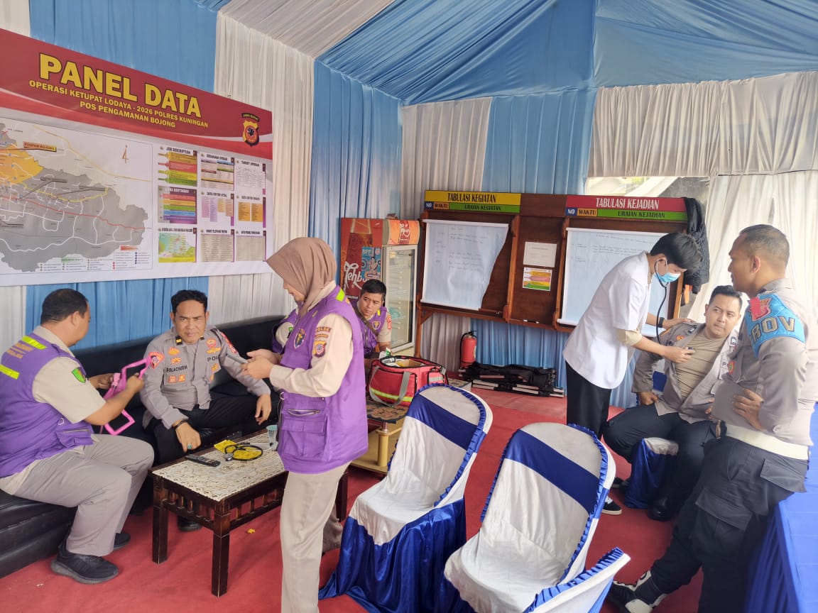 KUNINGAN โ Di tengah intensitas tugas pengamanan arus mudik Lebaran 1447 H, kesehatan personel menjadi prioritas utama jajaran kepolisian. Pada Jumat siang, 20 Maret 2026, personel yang bertugas di Pos Pengamanan (Pospam) Bojong menerima kunjungan tim medis dari Biddokkes RS Bhayangkara Indramayu. Kegiatan ini bertujuan untuk memantau kondisi fisik para petugas agar tetap dalam kondisi prima saat memberikan pelayanan kepada masyarakat selama Operasi Ketupat Lodaya 2026 berlangsung.Kapolres Kuningan AKBP Muhammad Ali Akbar, S.I.K., M.Si., melalui Kapospam Bojong AKP Mohamad Faisal, S.H., menjelaskan bahwa pemeriksaan kesehatan ini meliputi pengecekan tekanan darah, pemberian vitamin, hingga konsultasi medis langsung dengan dokter. Tim medis juga mengakomodasi berbagai keluhan kesehatan dari personel guna diberikan penanganan dini agar tidak mengganggu jalannya tugas pengamanan di titik sentral tersebut.Kunjungan tim Biddokkes ini merupakan bentuk dukungan moril dan nyata bagi anggota yang telah bersiaga penuh di lapangan. Dengan stamina yang terjaga, diharapkan personel dapat menjalankan tugas dengan lebih responsif, terutama dalam menghadapi dinamika arus lalu lintas dan potensi gangguan kamtibmas di wilayah Bojong. Kesehatan yang stabil adalah modal utama dalam mewujudkan slogan “Mudik Aman, Keluarga Bahagia”.Seluruh rangkaian pemeriksaan kesehatan yang dimulai pukul 11.15 WIB tersebut berjalan dengan aman dan lancar. Pihak Polres Kuningan melalui Kasiddokes tetap mengimbau kepada seluruh personel yang terlibat operasi untuk selalu menjaga pola makan dan waktu istirahat di sela-sela penugasan. Kesiapsiagaan yang dibarengi dengan kebugaran fisik ini menjadi kunci kesuksesan Polri dalam mengawal momentum Hari Raya Idul Fitri tahun ini.
