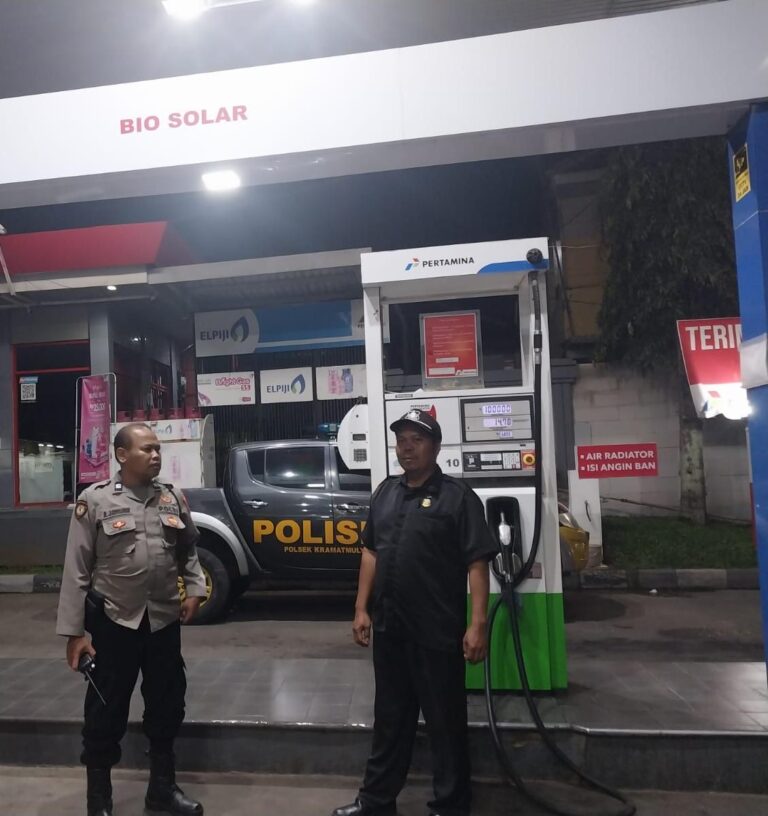 Patroli Malam Hari di Wilayah Hukum Polsek Kramatmulya Sambangi Security SPBU Desa Cilowa.