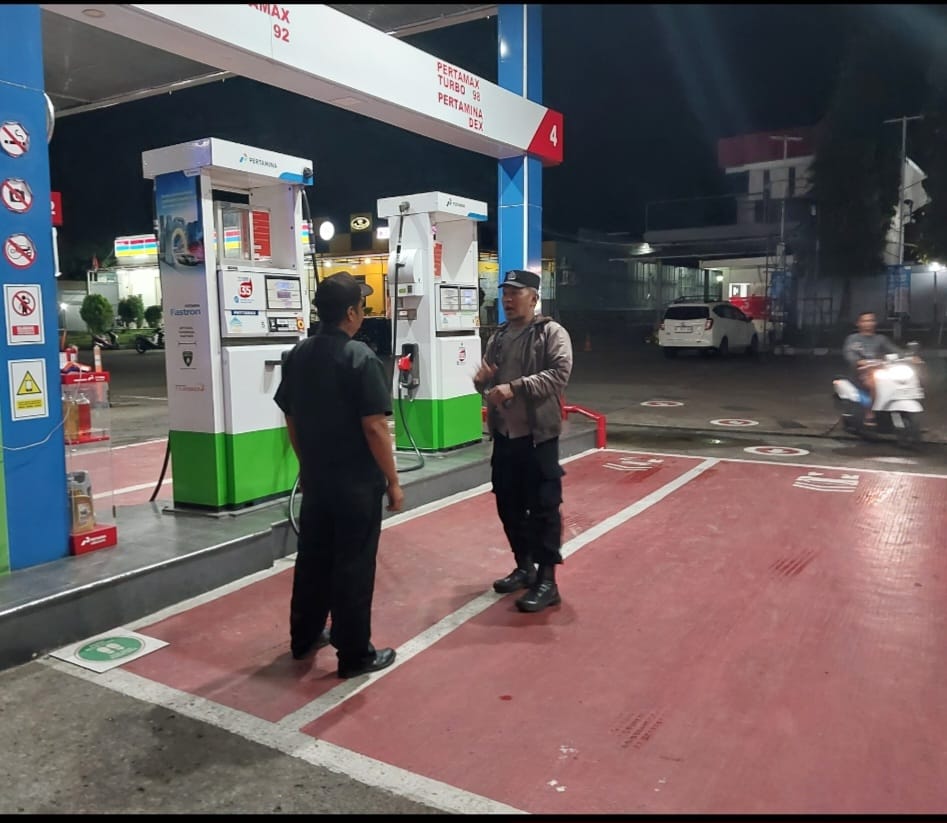 Patroli Malam Hari di Wilayah Hukum Polsek Kramatmulya Sambangi Security SPBU Desa Cilowa