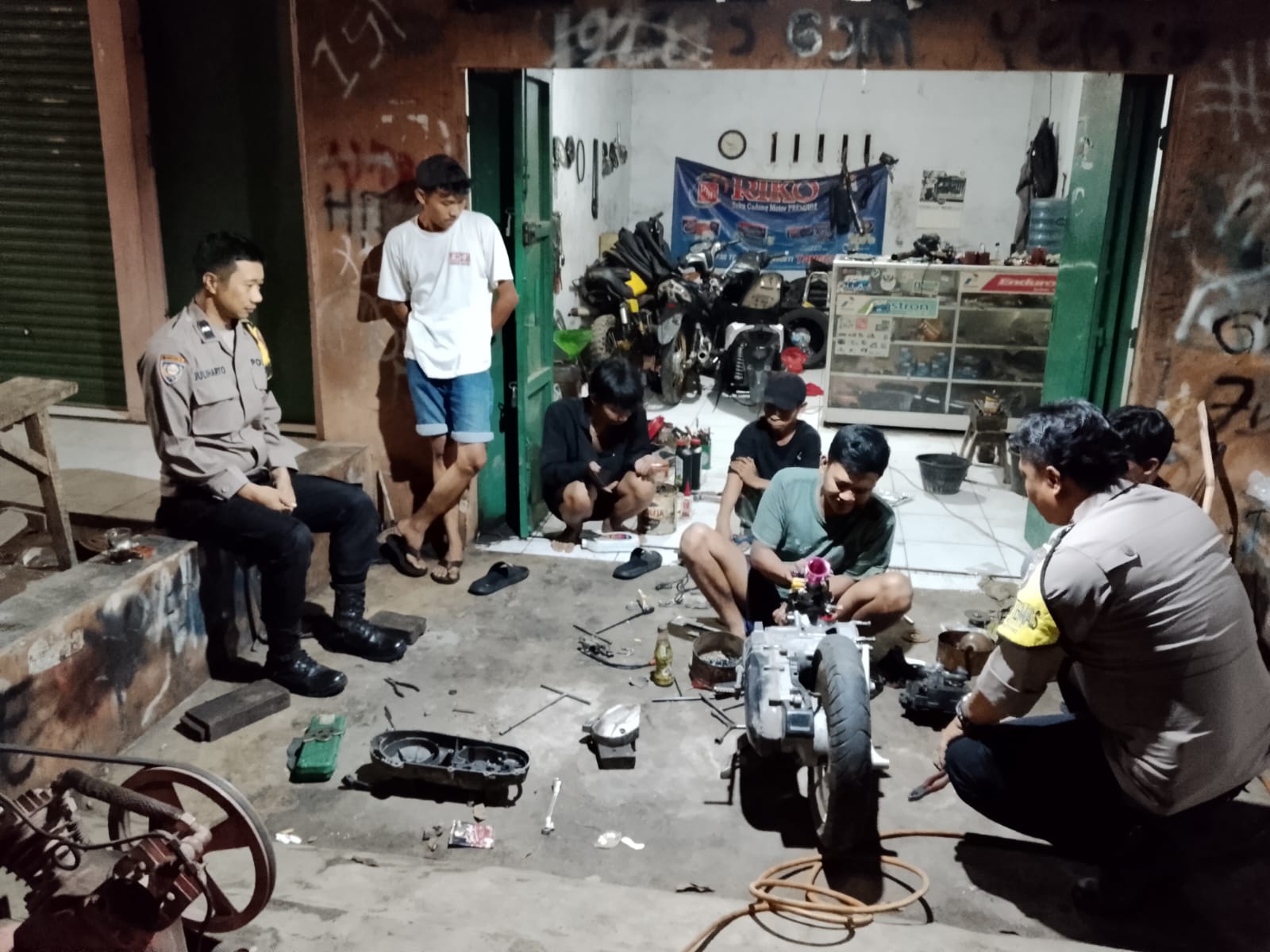 Polres Kuningan Polda Jabar – Anggota Bhabinkamtibmas Polsek Ciawigebang Polres Kuningan Polda Jabar, Aipda Juli Harto dan Aipda Mulyadi, melaksanakan Patroli KRYD (Kegiatan Rutin Yang Ditingkatkan) pada malam hari dengan menyambangi salah satu bengkel sepeda motor di Desa Kadurama, Kecamatan Ciawigebang, Kabupaten Kuningan, Jumat (21/11).