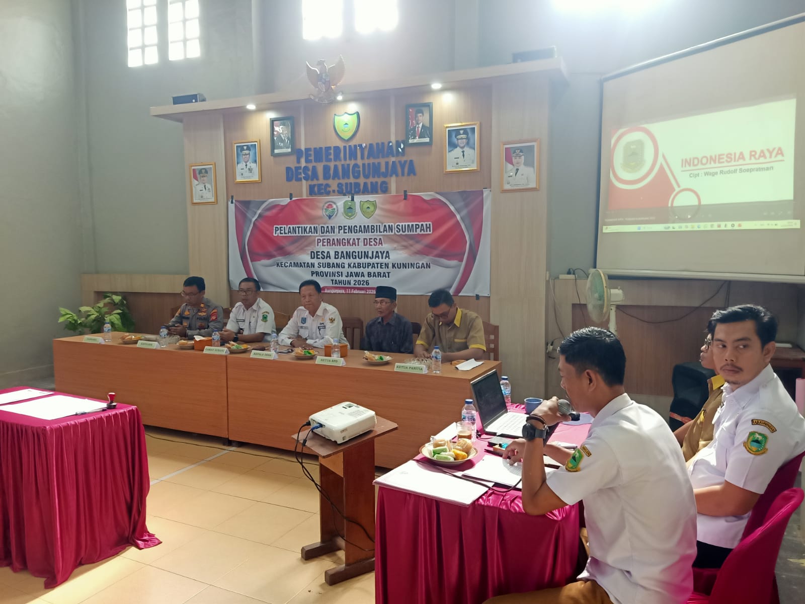 Kuningan – Pemerintah Desa Bangunjaya, Kecamatan Subang, Kabupaten Kuningan, melaksanakan kegiatan Pelantikan Perangkat Desa Tahun 2026 pada Selasa, 11 Februari 2026, pukul 09.00 WIB hingga selesai. Kegiatan tersebut bertempat di Aula Kantor Balai Desa Bangunjaya dan berlangsung dengan tertib, aman, serta kondusif.Pelantikan ini dilaksanakan berdasarkan Surat Keputusan Kepala Desa Bangunjaya Nomor: 400.14.1.33/KPTS.10-Pemdes/2026 tanggal 10 Januari 2026 tentang Pengangkatan Perangkat Desa Bangunjaya.Turut hadir dalam kegiatan tersebut Camat Subang Kuswondo Parmadirja, S.Pd., M.Pd., Kapolsek Subang IPTU Suhandi, S.M., para Kasi dan Kasubag Kecamatan Subang, Kepala Desa Bangunjaya Uzer Jaenuddin, Ketua BPD Desa Bangunjaya beserta anggota, Ketua LPM beserta anggota, perangkat desa, serta tokoh agama, tokoh masyarakat, dan tokoh adat Desa Bangunjaya.Adapun susunan acara dimulai dengan pembukaan, menyanyikan Lagu Indonesia Raya, doa, pembacaan Surat Keputusan Kepala Desa tentang pengangkatan perangkat desa, pengambilan sumpah jabatan, penandatanganan berita acara sumpah jabatan, penyerahan Surat Keputusan, sambutan-sambutan dari Kepala Desa Bangunjaya, Ketua BPD, dan Camat Subang, dilanjutkan dengan penutup serta ramah tamah.Perangkat desa yang dilantik adalah:Obi Muhtar, S.Kep, lahir di Kuningan, 19 November 1989, pendidikan S1, alamat Dusun Bojong RT 014 RW 005 Desa Bangunjaya, dilantik sebagai Kasi Kesejahteraan.Azis Fadilah, S.E, lahir di Kuningan, 13 Desember 1993, pendidikan S1, alamat Dusun Cilembang RT 005 RW 002 Desa Bangunjaya, dilantik sebagai Kepala Dusun Cilembang 1.Pelantikan ini dilaksanakan karena adanya kekosongan jabatan perangkat desa yang sebelumnya telah memasuki masa purna bakti. Pengangkatan perangkat desa dilakukan melalui proses seleksi oleh Tim Seleksi Perangkat Desa dari Kecamatan Subang, dengan tujuan meningkatkan kualitas pelayanan kepada masyarakat.Kapolsek Subang IPTU Suhandi, S.M. menyampaikan bahwa selama kegiatan berlangsung situasi tetap aman, tertib, dan kondusif.Dengan dilantiknya perangkat desa yang baru, diharapkan roda pemerintahan Desa Bangunjaya dapat berjalan lebih optimal serta pelayanan kepada masyarakat semakin baik dan profesional.