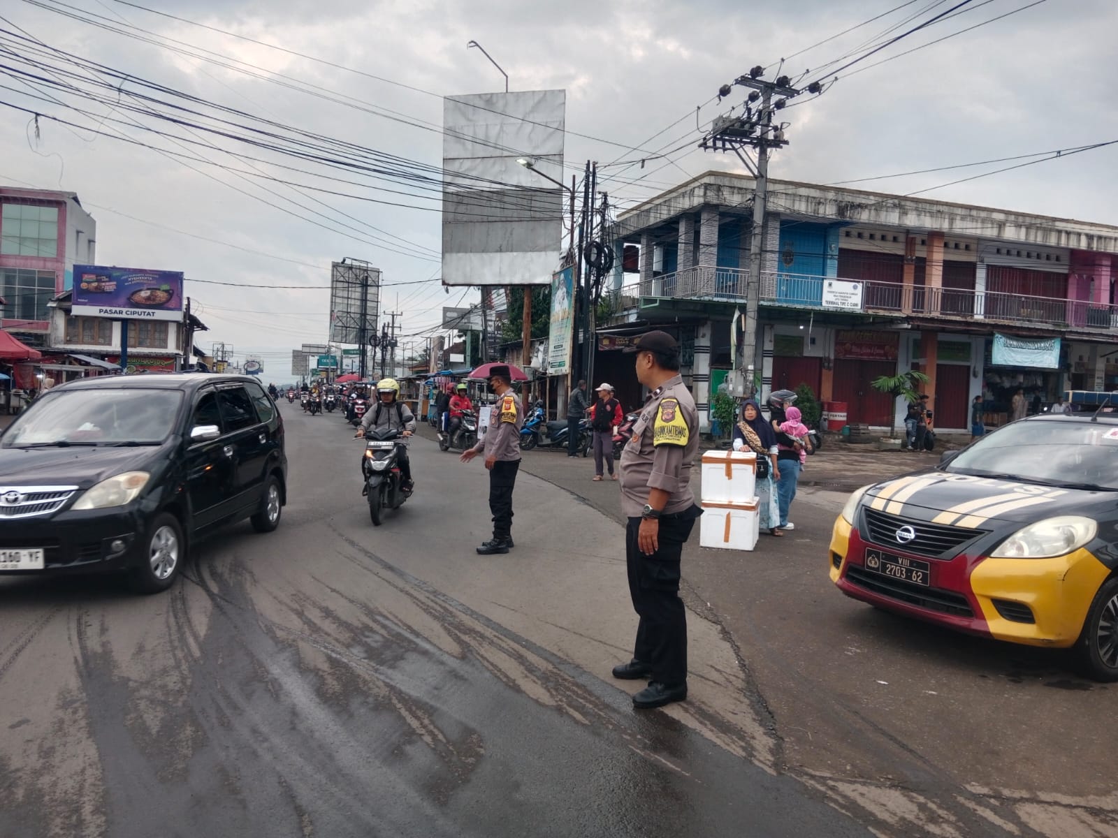 Polres Kuningan Polda Jabar – Anggota Pos Pengamanan (Pos PAM) Ciawigebang Operasi Ketupat Lodaya 2026 Polres Kuningan Polda Jabar, Aipda Mulyadi bersama Bripka Hendri Priyono melaksanakan kegiatan pengamanan sekaligus pengaturan arus lalu lintas di Terminal Ciawigebang, Kecamatan Ciawigebang, Kabupaten Kuningan, Senin (16/3/2026).
