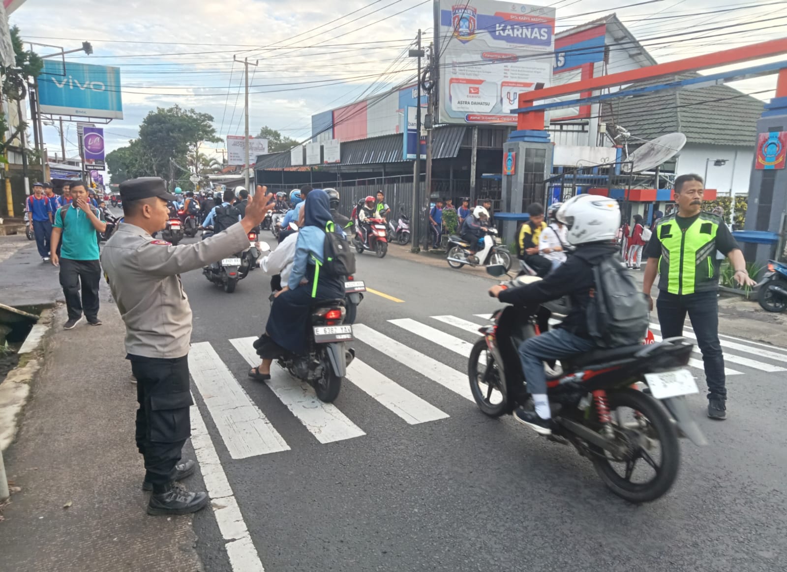 Personil Polsek Cigugur laksanakan pengaturan lalu lintas pagi hari di smk karnas