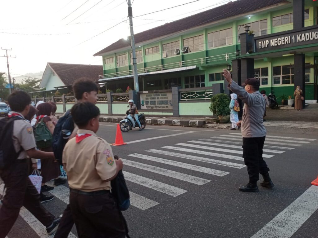 Personil Polsek Kadugede melaksanakan kegiatan Police Hazard (PH) berupa pengaturan lalu lintas dan antisipasi gangguan kamtibmas di persimpangan jalan Terminal Kadugede dan di jln raya persimpangan desa babatan kec.kadugede Kecamatan Kadugede, di jln depan SDN Windujanten dan d jln deoan SMAN1 Kadugede kec.kadugede Kabupaten Kuningan, pada Selasa pagi (14/04/2026).