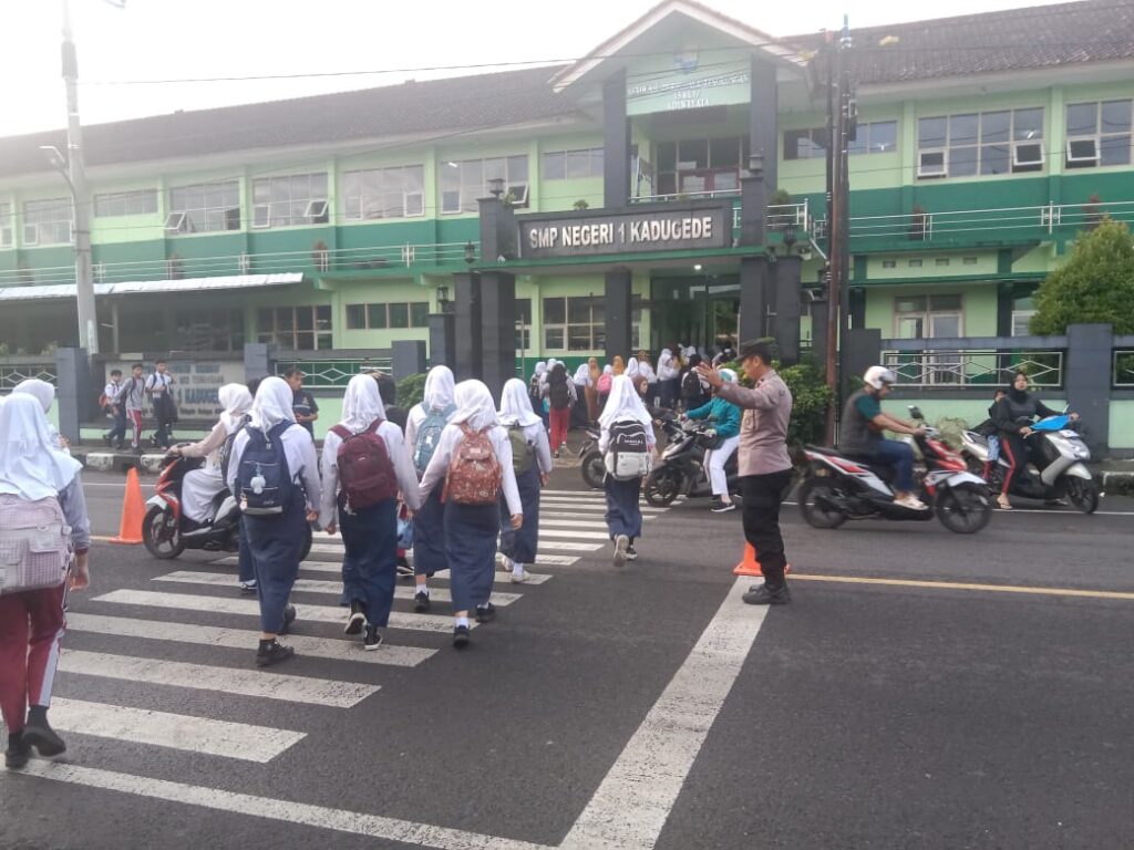 Personil Polsek Kadugede melaksanakan kegiatan Police Hazard (PH) berupa pengaturan lalu lintas dan antisipasi gangguan kamtibmas di persimpangan jalan Terminal Kadugede dan di jln raya persimpangan desa babatan kec.kadugede Kecamatan Kadugede, di jln depan SDN Windujanten dan d jln deoan SMAN1 Kadugede kec.kadugede Kabupaten Kuningan, pada Kamis pagi (16/04/2026).