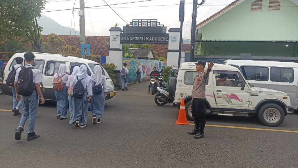 Personil Polsek Kadugede melaksanakan kegiatan Police Hazard (PH) berupa pengaturan lalu lintas dan antisipasi gangguan kamtibmas di persimpangan jalan Terminal Kadugede dan di jln raya persimpangan desa babatan kec.kadugede Kecamatan Kadugede, di jln depan SDN Windujanten dan d jln deoan SMAN1 Kadugede kec.kadugede Kabupaten Kuningan, pada Senin pagi (20/04/2026).