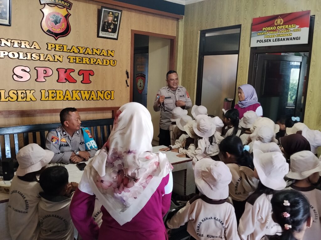 Sebanyak 52 peserta didik TK Negeri Cinagara disambut hangat oleh Kanit Binmas Polsek Lebakwangi, Hendrik Purwanto, bersama anggota piket.
