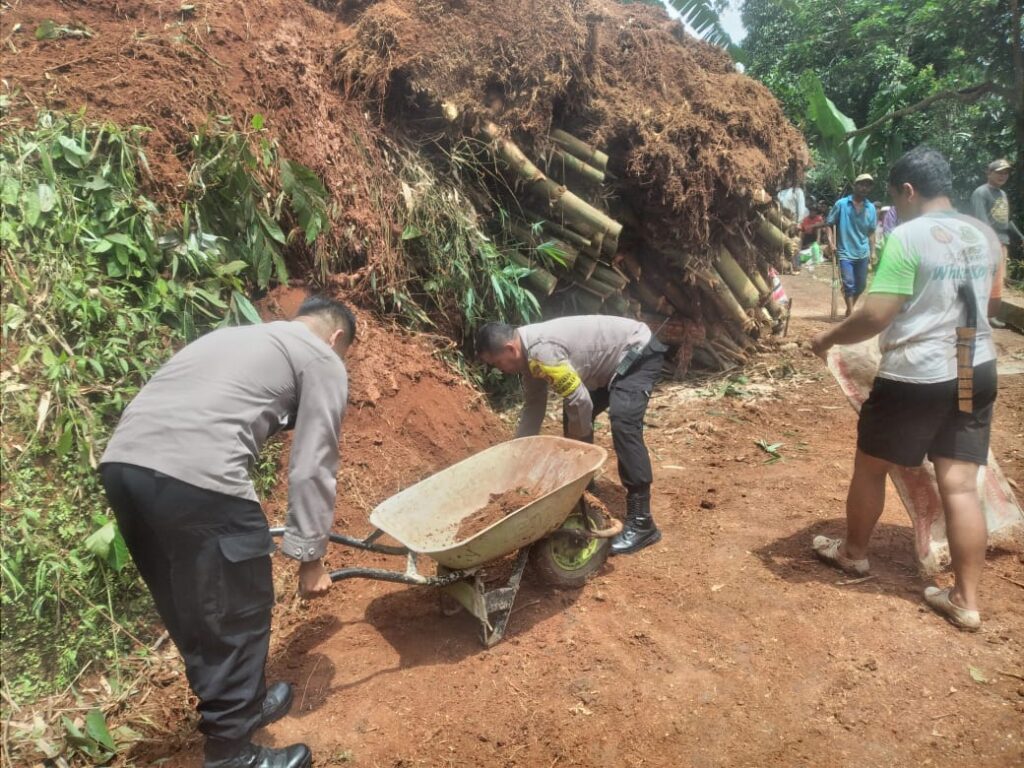 Material longsor berupa tanah dan bebatuan sempat menghambat aktivitas warga serta akses transportasi. Dengan peralatan sederhana, anggota Polsek dan warga bahu-membahu membersihkan area terdampak.