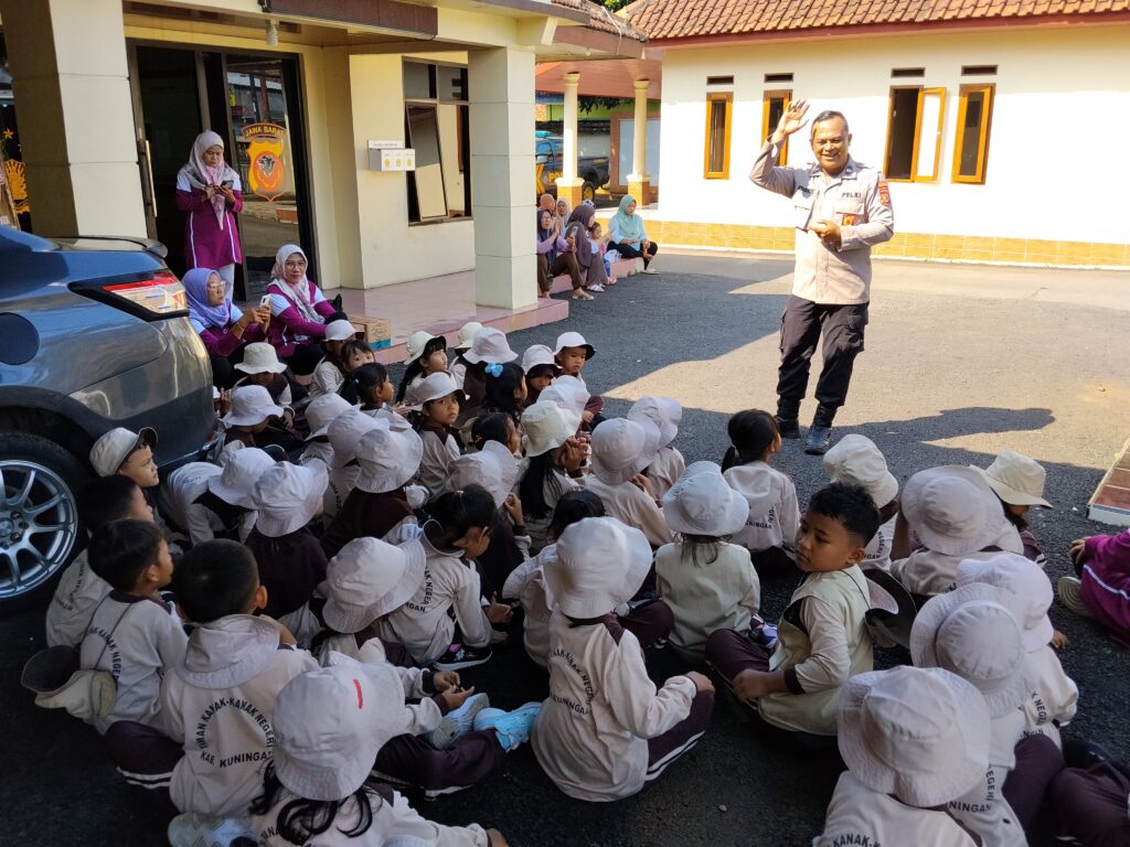 Lebakwangi – Semangat kebersamaan dan keceriaan terpancar dalam kegiatan Polisi Sahabat Anak yang digelar di Mapolsek Lebakwangi bersama siswa TK Negeri Cinagara, Rabu (15/04/2026) pukul 07.30 WIB.