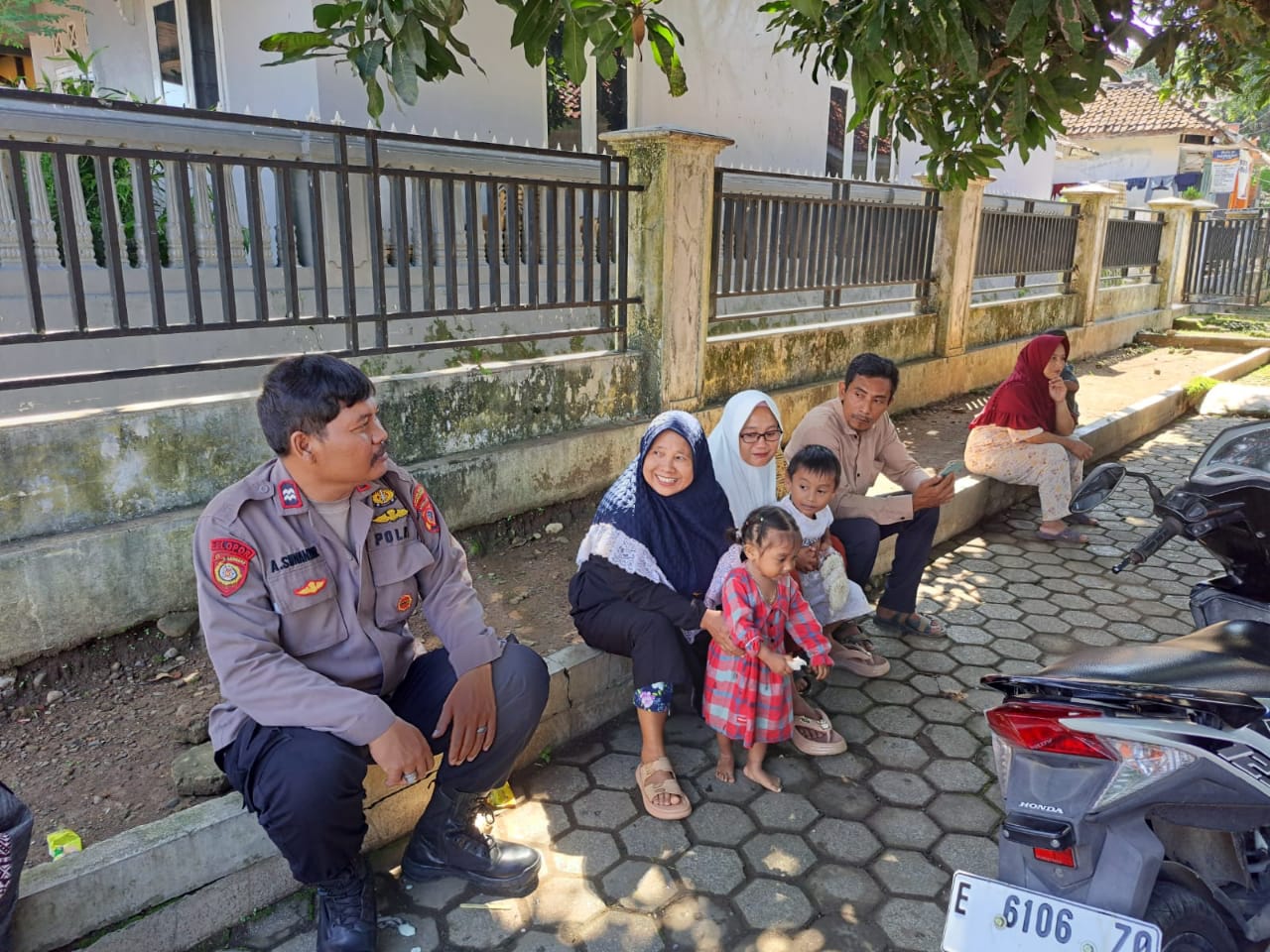 Terlihat seorang anggota Polsek Ciwaru duduk santai bersama warga, termasuk ibu-ibu dan anak-anak, di pinggir jalan lingkungan permukiman. Suasana penuh keakraban tampak jelas, di mana petugas bercengkrama sekaligus menyampaikan imbauan penting terkait keamanan lingkungan.