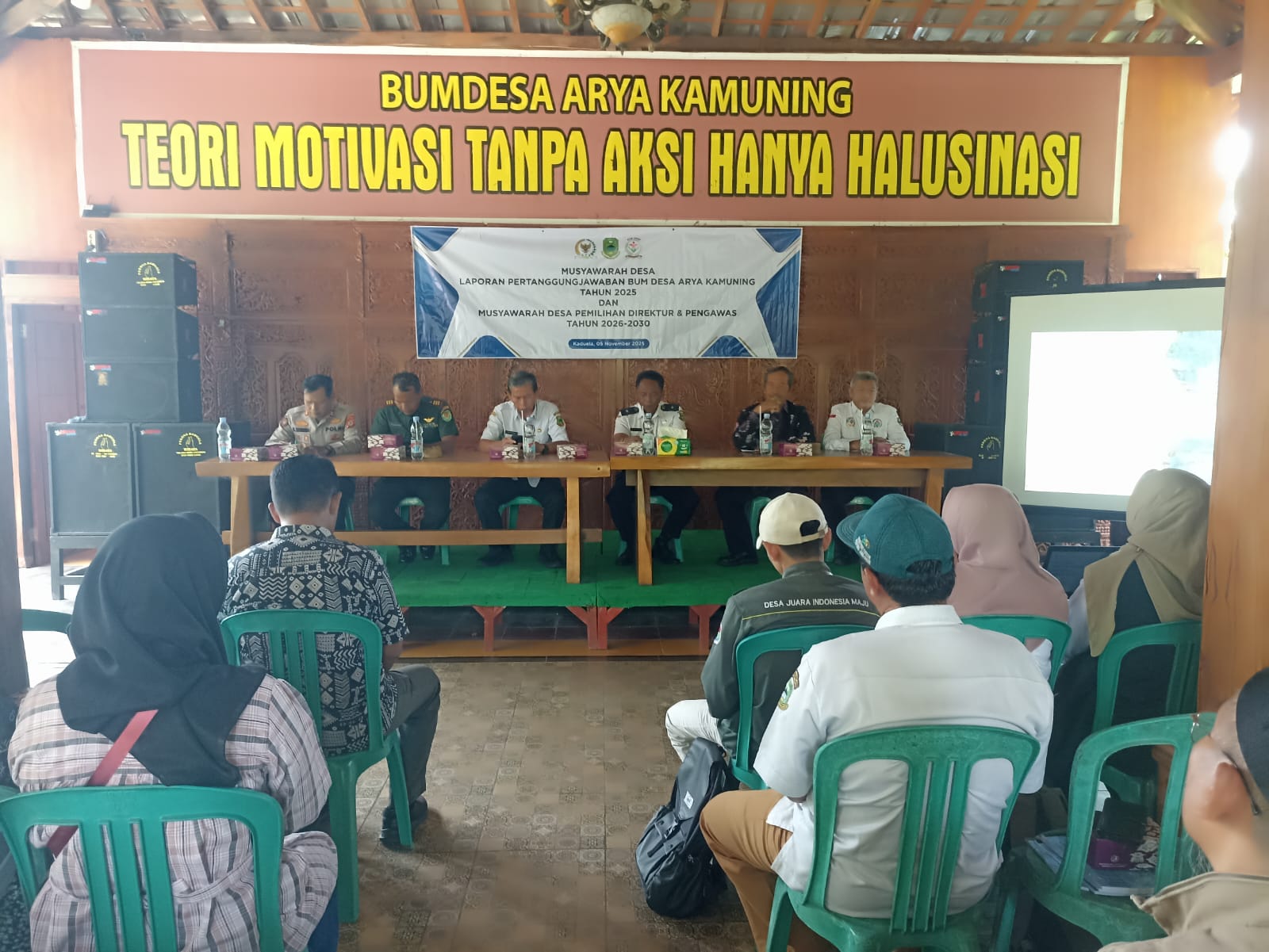Pasawahan – Kapolsek Pasawahan IPTU Enang Kurnia bersama Bhabinkamtibmas Desa Kaduela Brigpol Wahyu Nopiyanto Hermawan, S.H. melaksanakan pengamanan dan pendampingan kegiatan Musdesus Desa Kaduela yang membahas laporan pertanggungjawaban BUMDes Arya Kamuning periode 2021–2024, Kamis (6 November 2025).