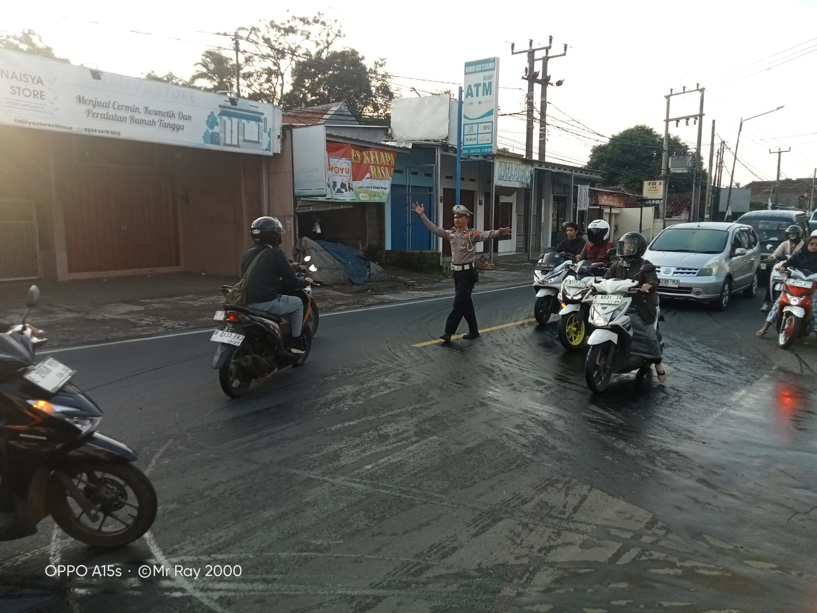 Pos Pam Bojong Polsek Cilimus melaksanakan pengaturan pagi untuk menjaga kelancaran arus lalu lintas.