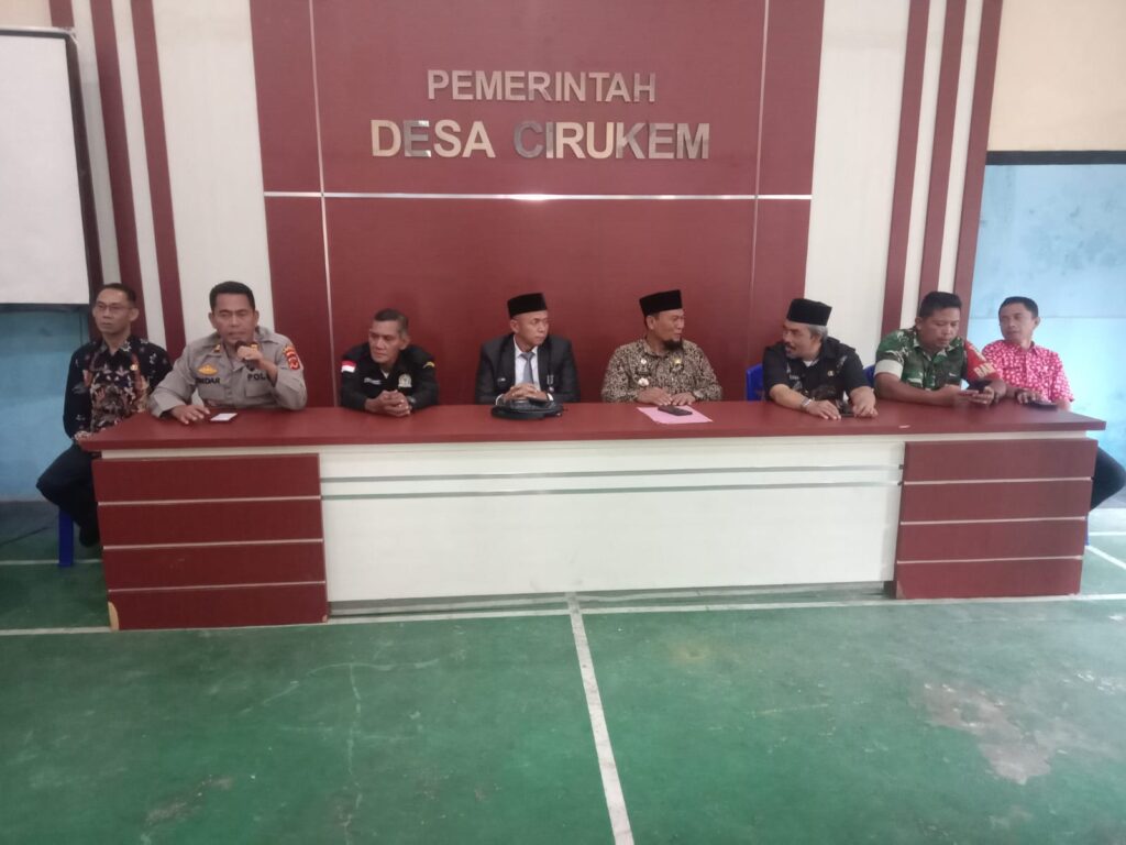 Acara serah terima jabatan Penjabat Kepala Desa Cirukem yang berlangsung 27 Februari 2026 dihadiri Camat, Kapolsek, Babinsa, Kasi dan Kasubag kecamatan, Ketua BPD, LPM, PKK serta tokoh agama dan masyarakat. Suasana terlihat penuh khidmat.