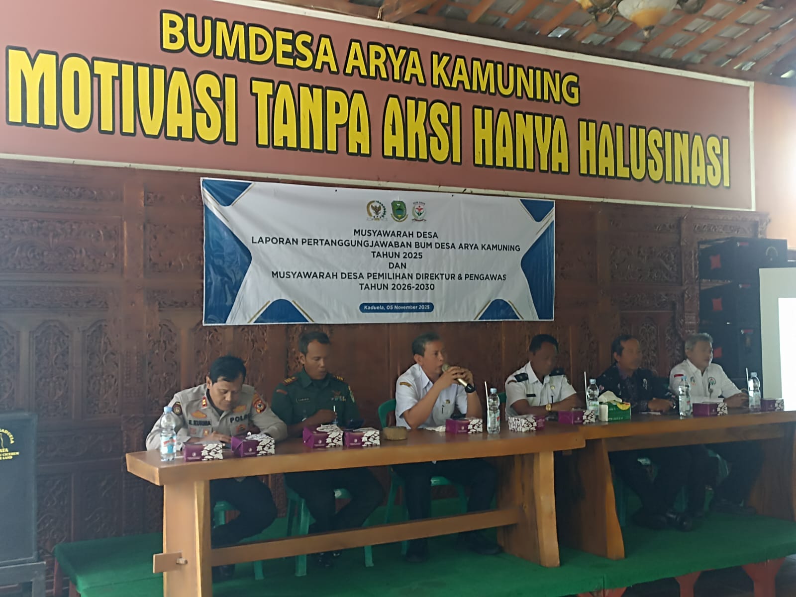 Pasawahan – Kapolsek Pasawahan IPTU Enang Kurnia didampingi Bhabinkamtibmas Desa Kaduela Brigpol Wahyu Nopiyanto Hermawan, S.H. menghadiri kegiatan Musdesus Desa Kaduela di Pendopo Telaga Biru yang membahas laporan pertanggungjawaban BUMDes Arya Kamuning periode 2021–2024, Kamis (6 November 2025).
