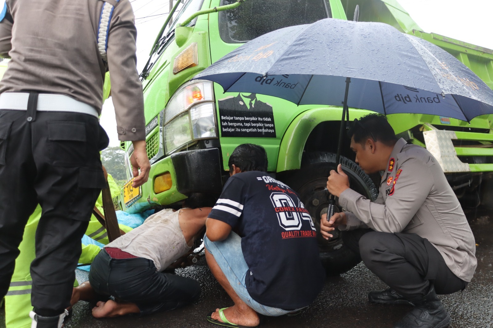 Dalam situasi tersebut, Kepala Kepolisian Resor Kuningan AKBP Muhammad Ali Akbar turun langsung ke lokasi kejadian untuk memastikan penanganan berjalan cepat, aman, dan tertib. Tidak hanya melakukan pengawasan, Kapolres juga terlihat sigap membantu sopir truk yang mengalami kesulitan saat kendaraan tidak dapat bergerak akibat ban kehilangan traksi di jalan yang licin.