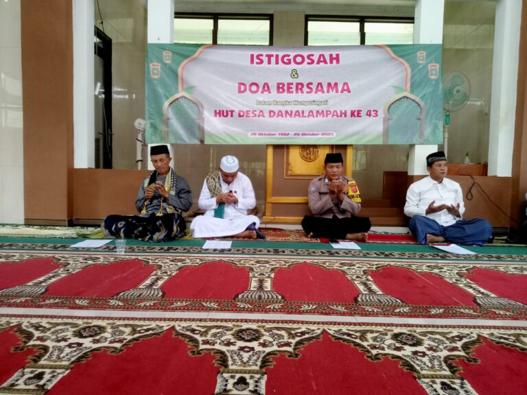 Danalampah – Bhabinkamtibmas Desa Danalampah Polsek Pancalang menghadiri kegiatan Istighosah dan doa bersama dalam rangka memperingati Hari Jadi Desa Danalampah, pada Jumat (24/10). Kegiatan ini berlangsung di aula balai desa dengan penuh khidmat dan dihadiri oleh perangkat desa, tokoh agama, tokoh masyarakat, serta warga setempat.