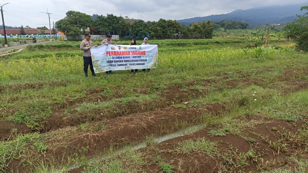 Kuningan – Dalam rangka mendukung program Swasembada Pangan, Polsek Kadugede Polres Kuningan menggelar kegiatan Penanaman Jagung Hibrida di Lahan kering / Non Lahan Baku Sawah (LBS) milik Kelompok tani Desa Nusaherang Kecamatan Nusaherang Kabupaten Kuningan. Kegiatan ini berlangsung pada Kamis (06/11/2025) di RT 001 RW 002 Blok ciseureuh dan melibatkan sinergi lintas sektor dari berbagai unsur pemerintahan dan masyarakat.