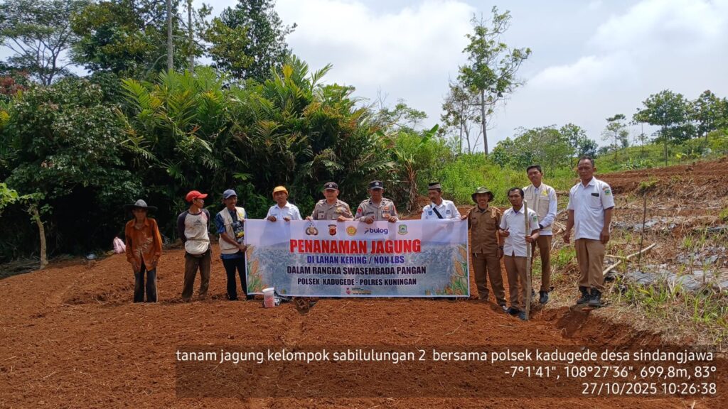 Kuningan – Dalam rangka mendukung program Swasembada Pangan, Polsek Kadugede Polres Kuningan menggelar kegiatan Penanaman Jagung Hibrida di Lahan kering / Non Lahan Baku Sawah (LBS) milik Kelompok tani Sabilulungan 2 Desa Sindangjawa Kecamatan Kadugede, Kabupaten Kuningan. Kegiatan ini berlangsung pada Senin (27/10/2025) di Dusun manis RT 007 RW 002 Blok Pasir tengah dan melibatkan sinergi lintas sektor dari berbagai unsur pemerintahan dan masyarakat.
